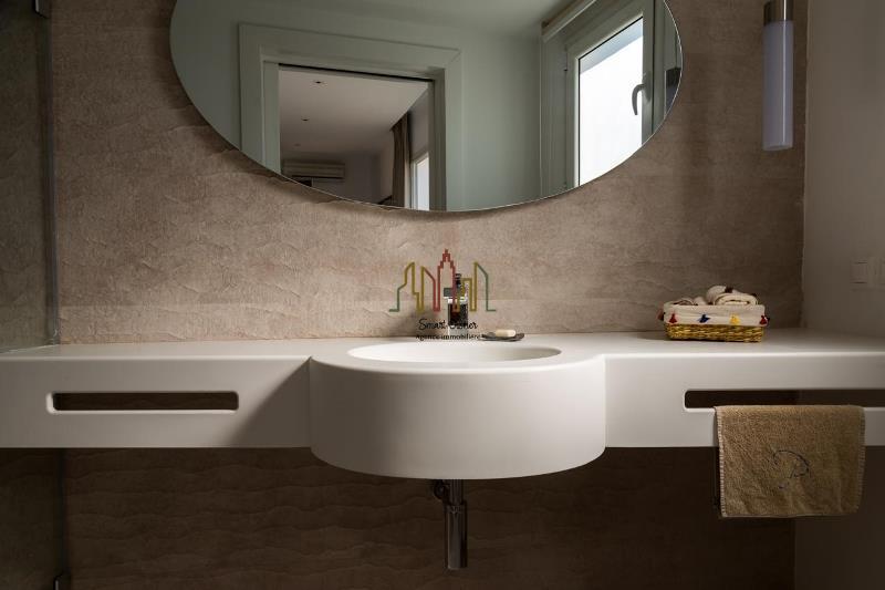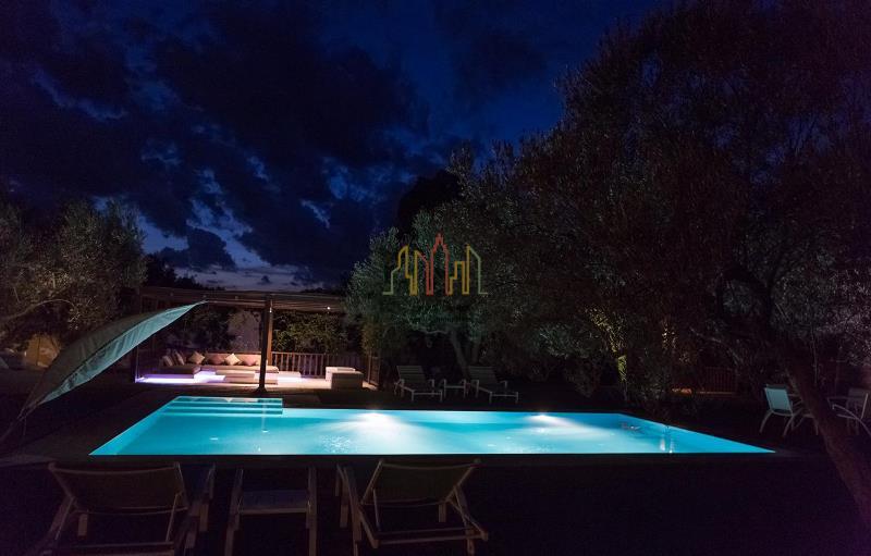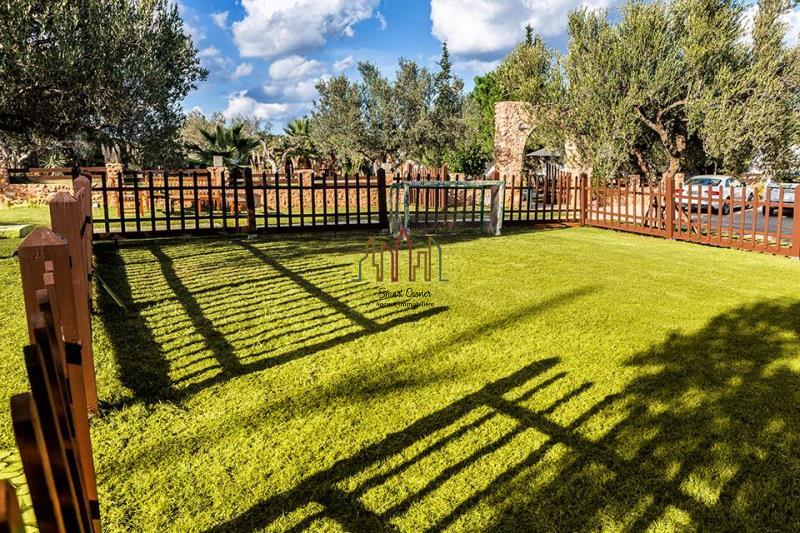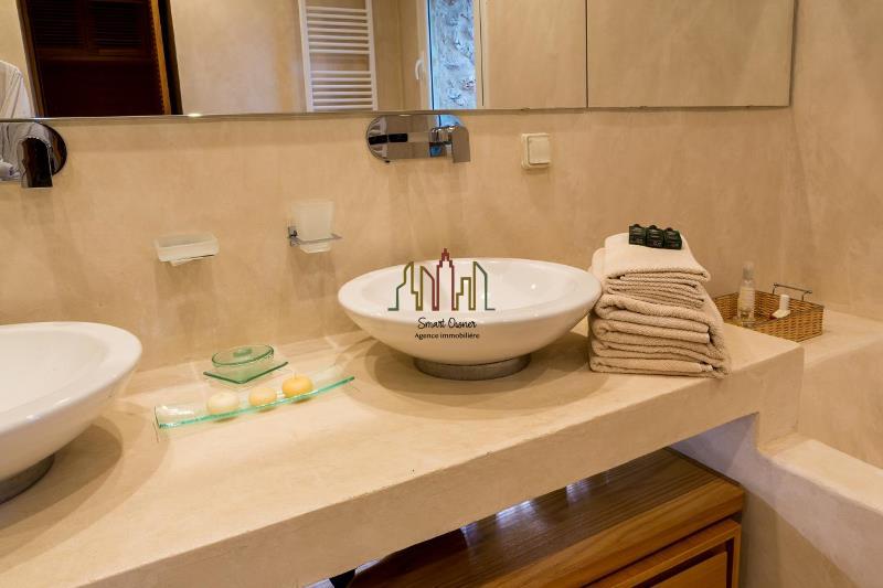 La maison se compose a l’extérieur d’une belle terrasse, une piscine, des banquettes, un grand jardin gazonné et planté, un espace pour les petits déjeuner, sauna, une salle de sport et une vestiaire, on trouve aussi deux bungalow, buanderie, deux chambres de service cuisine et un économat.
