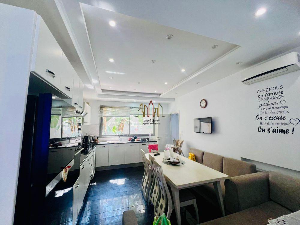 La villa comporte au rez de chaussée un spacieux salon, une cuisine aménagée bien équipée et une salle de bain.