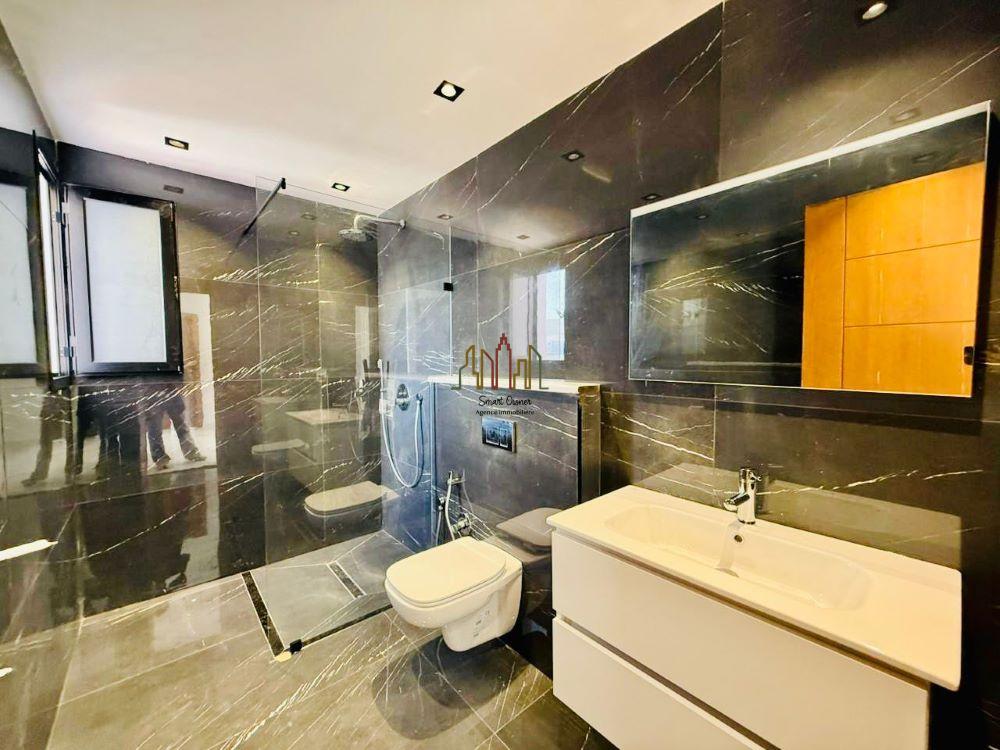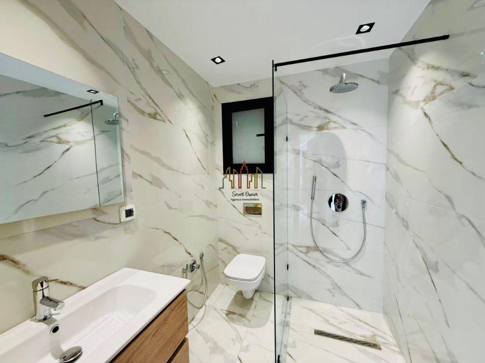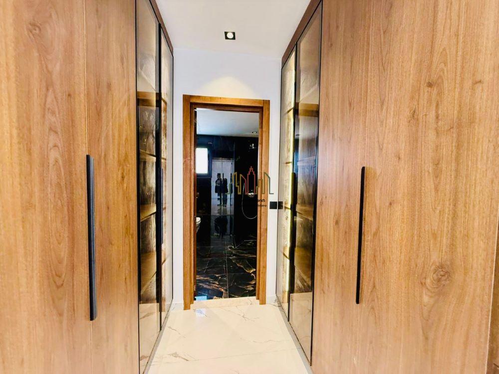 Quant à l’étage, on trouve une suite parentale avec sa propre salle de bain et dressing et deux terrasses, deux chambres à coucher avec une salle de bain commune.